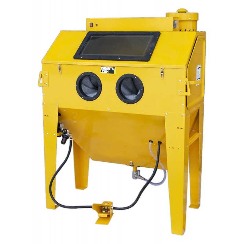 Spacious sandblasting cabinet with double-sided doors and a top lid. Powerful lighting, a foot switch, and high-quality protective equipment make operation safe and effortless.