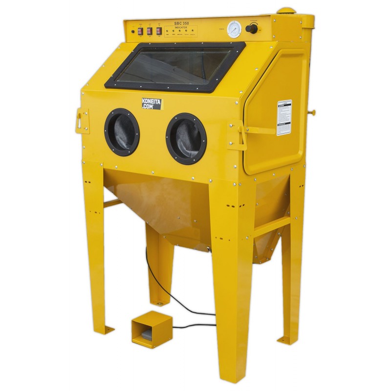 Spacious and powerful NOVA SBC350 sandblaster, featuring both a fixed and a handheld blasting gun, as well as an easy-to-use foot switch.